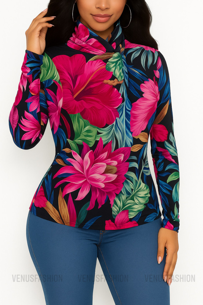 Csavart nyakú virágmintás felső